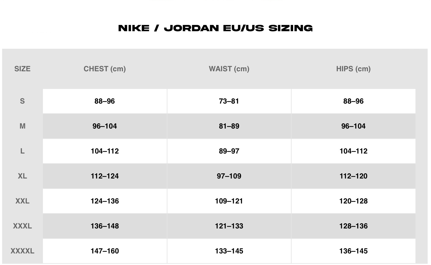 EU/US Fit Tops Size Chart