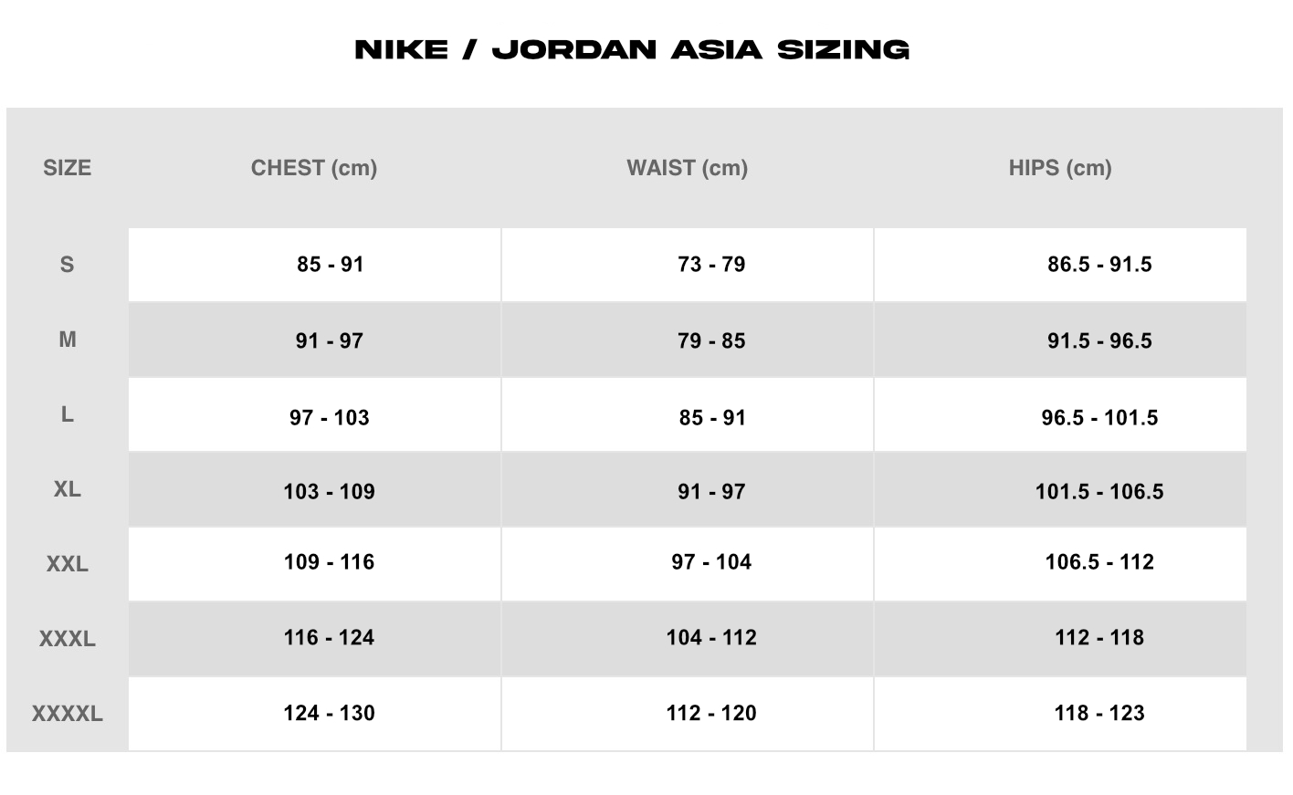 ASIA Fit Tops Size Chart